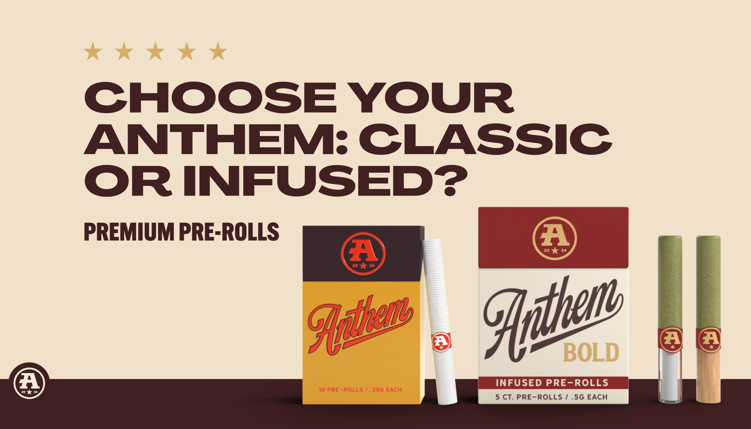 Anthem looks different, feels different, and hits different. They come in a unique cylindrical cigarette-style and flip-top box that grab attention and get people talking. The details are matched under the hood with a blend of American-grown cannabis strains curated for their consistent sativa, indica, or hybrid effects.